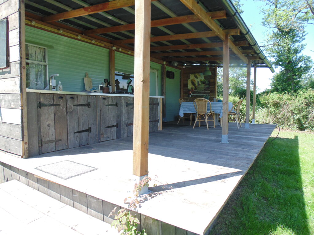 De caravan heeft een grote veranda (7.00 x 3.00), van hergebruikte, duurzame materialen, met een unieke grote buitenkeuken die eerder is gebruikt bij het populaire tv-programma “Heel Holland Bakt”.